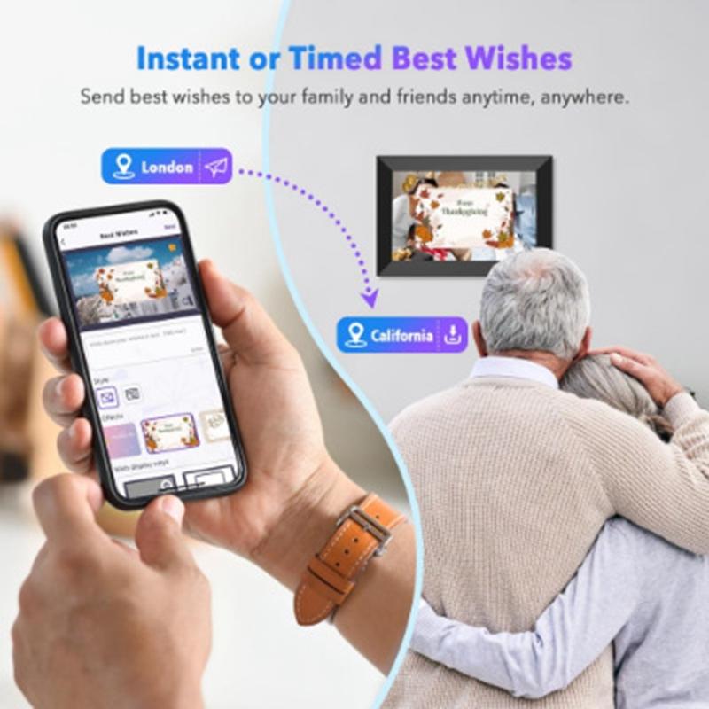 Mit der dazugehörigen mobilen App können Sie von überall aus sofort Fotos oder Videos an den Rahmen senden. Dank der Unterstützung für die Synchronisierung mit mehreren Geräten können mehrere Familienmitglieder Momente direkt an den Rahmen senden.