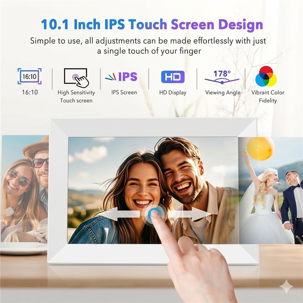 Genießen Sie Ihre Erinnerungen in lebendiger Klarheit mit einem 10.1-Zoll-IPS-Touchscreen mit einer Auflösung von 1280 × 800 und einem weiten Betrachtungswinkel von 178°. Perfekt für Fotos, Videos und Diashows mit satten Farben und großem Detailreichtum.