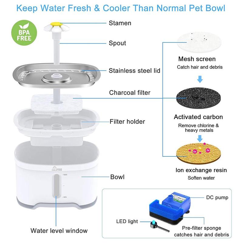Dieser Wasserspender ist hygienisch, langlebig und hilft, die Flüssigkeitszufuhr Ihrer Haustiere aufrechtzuerhalten. Das macht ihn zu einem unverzichtbaren Produkt für jeden tierfreundlichen Haushalt.