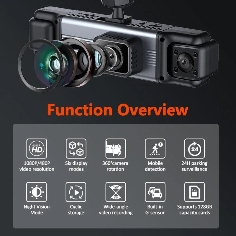 Mit dieser Dashcam mit 3.0-Zoll-IPS-Bildschirm und 4 Objektiven, die Ihre Fahrt in außergewöhnlicher Klarheit aufzeichnet, sind Sie auf der Straße sicher und umfassend geschützt. Mit einer 1080P-Frontkamera und drei zusätzlichen 480P-Seiten- und Rückobjektiven bietet sie eine vollständige Rundumabdeckung für ein sichereres und selbstbewussteres Fahrerlebnis.