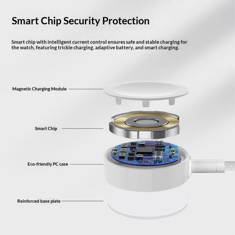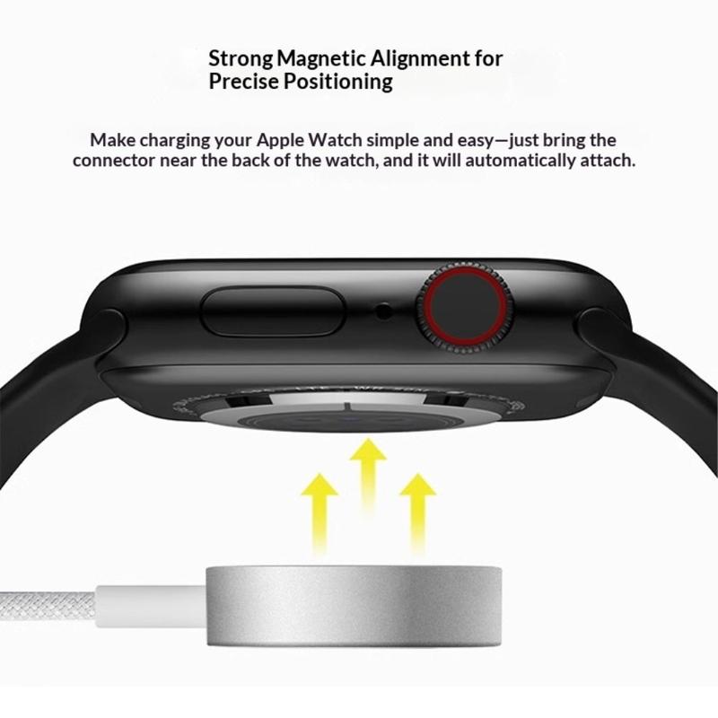 Das magnetische Ladedesign ermöglicht eine mühelose Ausrichtung auf kompatible Geräte. Legen Sie Ihre Apple Watch einfach auf das Ladegerät und es rastet in der richtigen Position ein, um einen stabilen Kontakt und eine effiziente Energieübertragung zu gewährleisten.