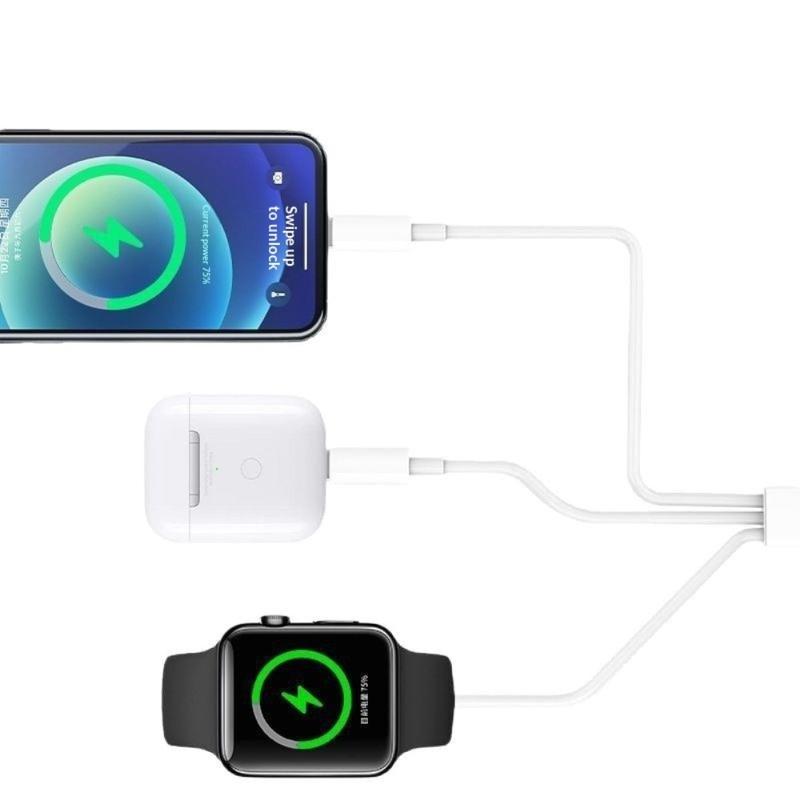 Das 3-in-1-Ladekabel wurde entwickelt, um das tägliche Aufladen zu vereinfachen, indem es mehrere Funktionen in einem praktischen Kabel vereint. Es unterstützt das kabellose Laden für die Apple Watch und ist damit die ideale Lösung für den Schreibtisch, den Nachttisch und auf Reisen.
