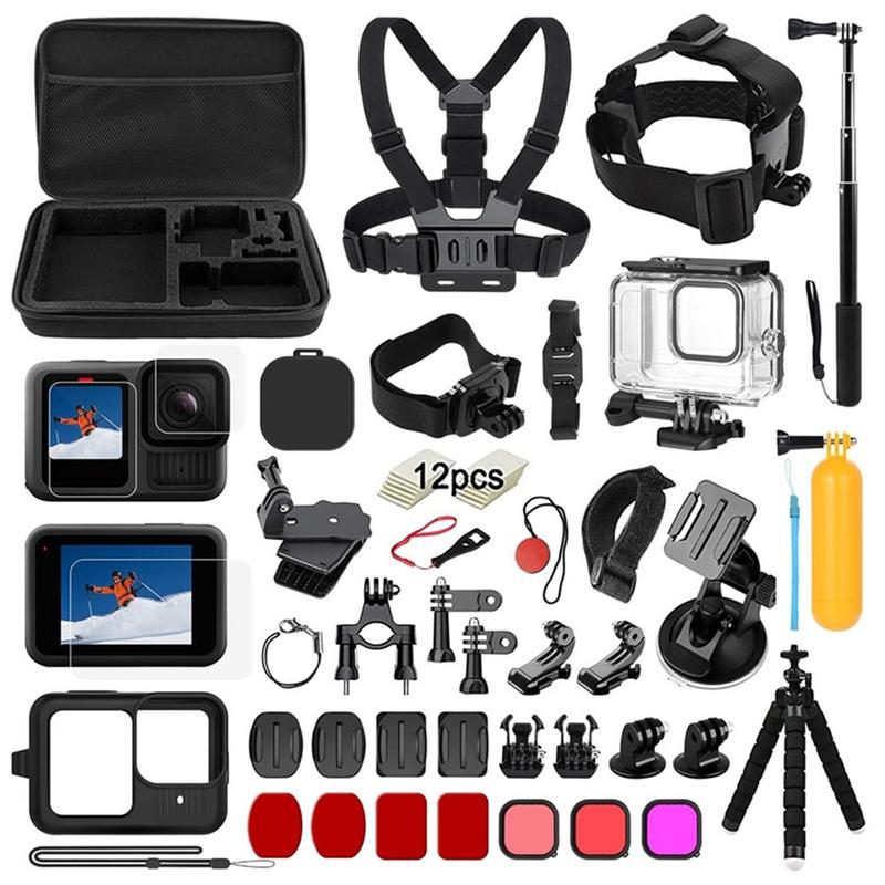 39-in-1-Zubehör-Kit für GoPro Hero13 Black - Wasserdichte Tasche, Brust- und Kopfgurt, Selfie-Stick, Halterungen + 9H Displayschutzfolien