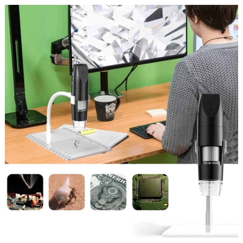 8 einstellbare LED-Leuchten sorgen für optimale Klarheit, während die 2-Megapixel-Kamera eine detaillierte Beobachtung von 3D-Proben wie Insekten, Münzen, Schmuck ermöglicht und dank eines 50- bis 1.000fachen Vergrößerungszooms jedes Detail genießen kann. Verbinden Sie dieses digitale Mikroskop über WiFi mit Ihrem Android- oder iOS-Gerät oder mit einem Windows- oder Mac-Computer. Wenn die WiFi-Verbindung nicht verfügbar ist, können Sie das microUSB-Kabel verwenden, um dieses Gadget mit einem USB-fähigen Gerät zu verbinden.