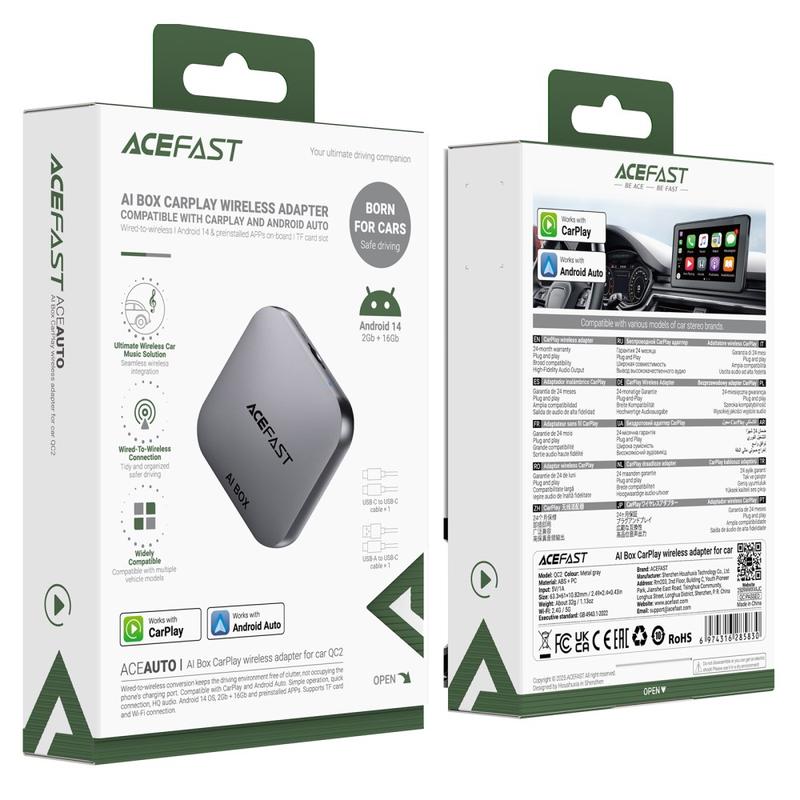 Die ACEFAST QC2 AI Box wertet Ihr Fahrzeug im Handumdrehen auf, indem sie herkömmliches kabelgebundenes CarPlay oder Android Auto in ein vollständig kabelloses System verwandelt. Sie wurde für ein reibungsloseres und angenehmeres Fahrerlebnis entwickelt und unterstützt sowohl iPhone- als auch Android-Geräte. Sie bietet eine schnelle Verbindung, nahtlose Steuerung und die Freiheit, auf Unterhaltungs-Apps direkt auf Ihrem Fahrzeugdisplay zuzugreifen. Mit seiner kompakten, leichten Bauweise und dem integrierten, erweiterbaren Speicher bringt es Komfort und Funktionalität auf höchstem Niveau in jedes kompatible Fahrzeug.