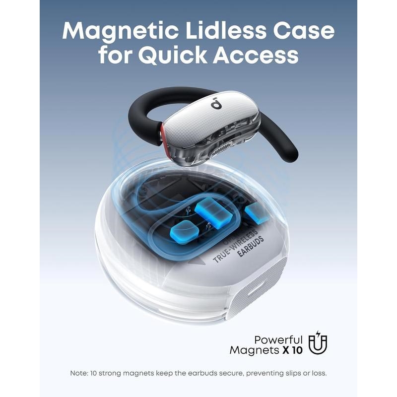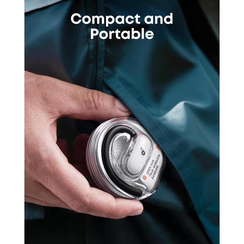 Die offenen Soundcore V40i-Kopfhörer wurden für einen aktiven Lebensstil entwickelt, bei dem Komfort, Aufmerksamkeit und Klangqualität wichtig sind. Mit ihrem innovativen offenen Design und den verstellbaren Ohrbügeln sitzen sie bequem außerhalb des Gehörgangs, sodass Sie Musik genießen und gleichzeitig Ihre Umgebung wahrnehmen können. Das schlanke, transparente Ladeetui ohne Deckel verleiht ihnen einen modernen Touch und ermöglicht einen schnellen, mühelosen Zugriff, wo immer Sie sind.