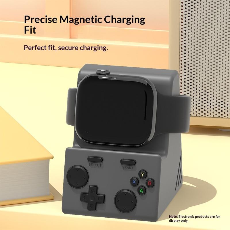 Verleihen Sie Ihrem Nachttisch oder Schreibtisch mit diesem Ladeständer für die Apple Watch im Stil einer Spielkonsole eine lustige und ordentliche Aufwertung. Er besteht aus weichem, kratzfestem Silikon, hält Ihre Uhr während des Ladevorgangs sicher an ihrem Platz und sorgt dank der integrierten Kabelaufbewahrung an der Unterseite für Ordnung. Dank seiner kompakten Größe lässt er sich leicht zwischen Zuhause, Büro oder auf Reisen transportieren, während sein minimalistisches Design sich natürlich in moderne Innenräume einfügt. Wichtigste Merkmale und Spezifikationen