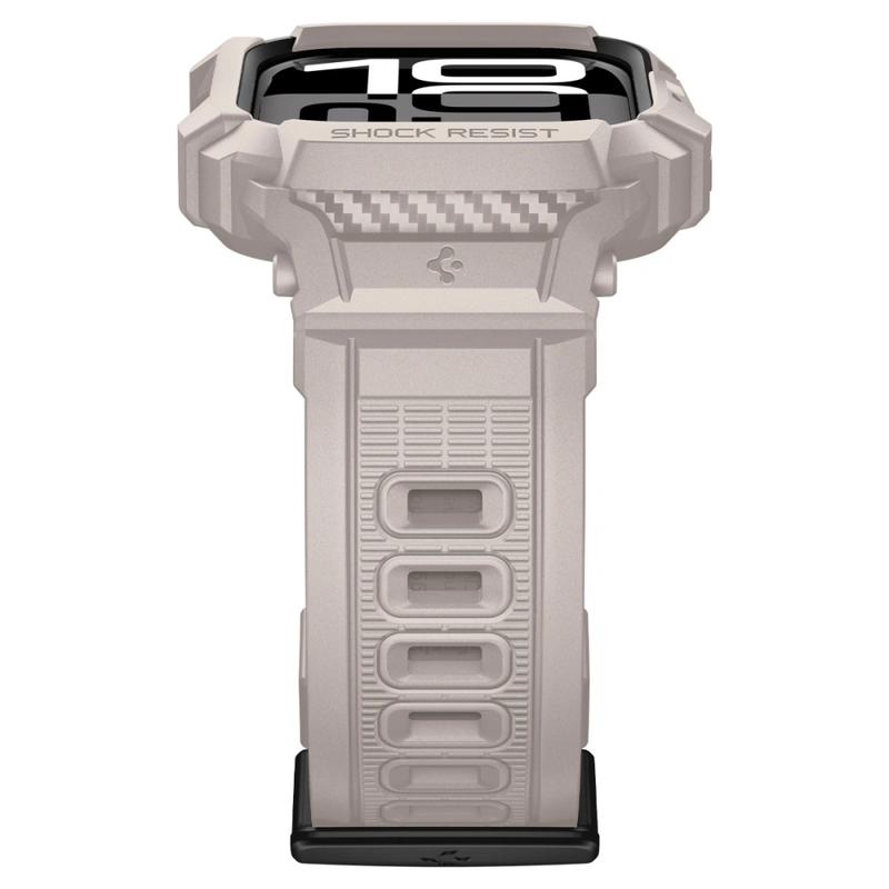 Das Spigen Rugged Armor Pro V2 für die Apple Watch Series 11/10 kombiniert ein sportliches Armband mit einer integrierten Schutzhülle und bietet Ihrer Uhr einen sicheren All-in-One-Schutz für den aktiven Alltag. Es besteht aus flexiblem, strapazierfähigem TPU mit einem Muster im Carbon-Look, das Stöße absorbiert und das Uhrengehäuse vor Kratzern schützt. Erhöhte Kanten um den Bildschirm bieten zusätzlichen Schutz, wenn die Uhr mit Oberflächen in Berührung kommt, während präzise Ausschnitte dafür sorgen, dass die Digital Crown, die Tasten und die Sensoren vollständig zugänglich bleiben.