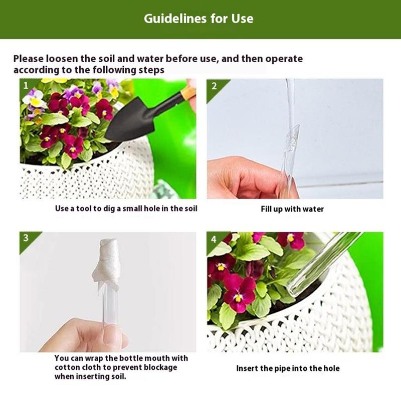 Die Verwendung der Kugeln ist mühelos - einfach mit Wasser füllen und in einem Winkel von 75°-85° in die Erde stecken. Einmal eingesetzt, regulieren die Kugeln die Bewässerung automatisch, ohne dass Werkzeuge oder komplizierte Einstellungen erforderlich sind.
