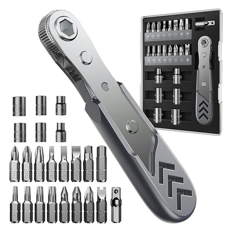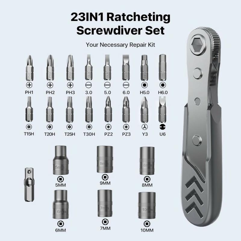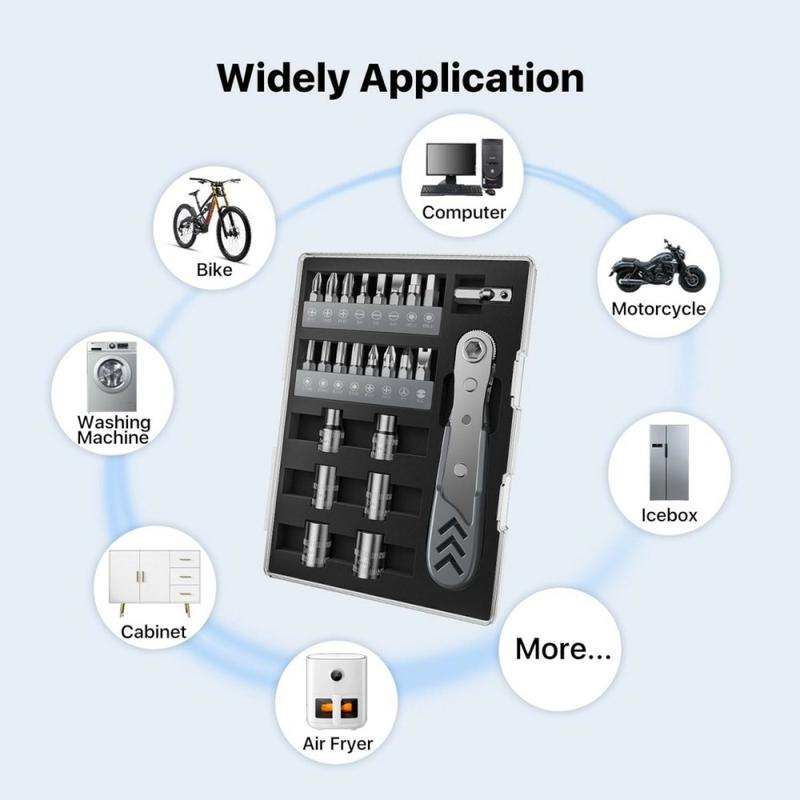 Mit dem AXTH 23-in-1-Winkelschraubendreher-Set lassen sich Reparaturen in engen Räumen mühelos durchführen. Dieses kompakte Werkzeugset wurde für Heimwerkerarbeiten, Elektronik, Reparaturen im Haushalt und allgemeine Wartungsarbeiten entwickelt und vereint einen 90-Grad-Schraubendreher, einen Präzisions-Ratschenmechanismus, magnetische Bits und Steckschlüsseleinsätze in einem praktischen Set.