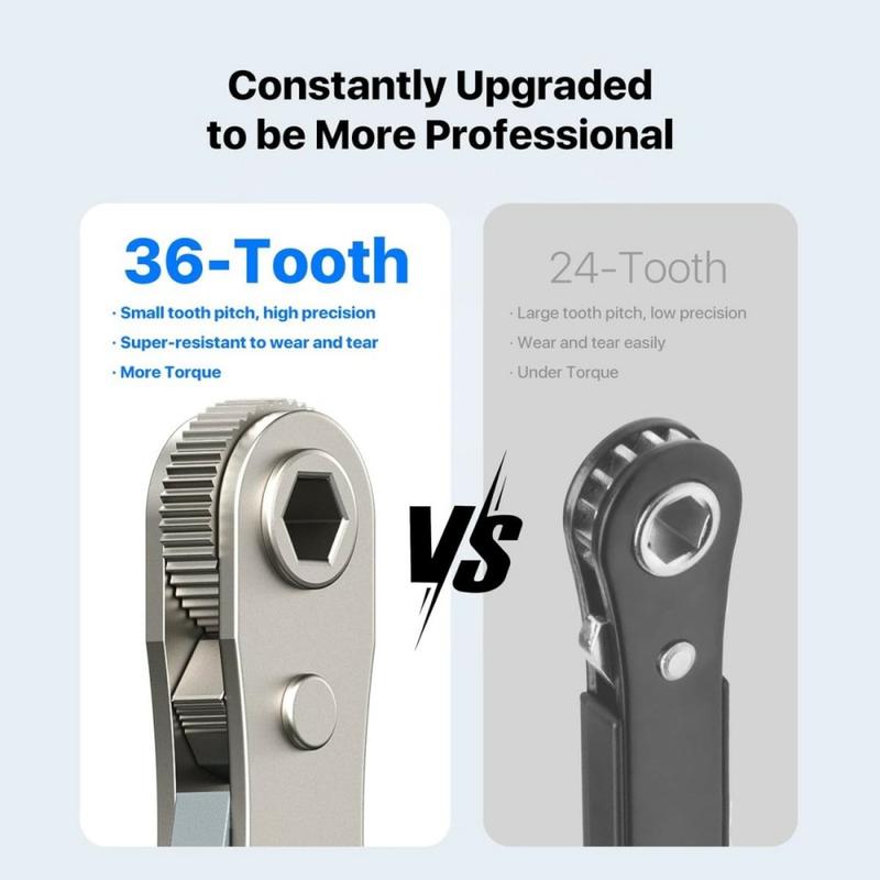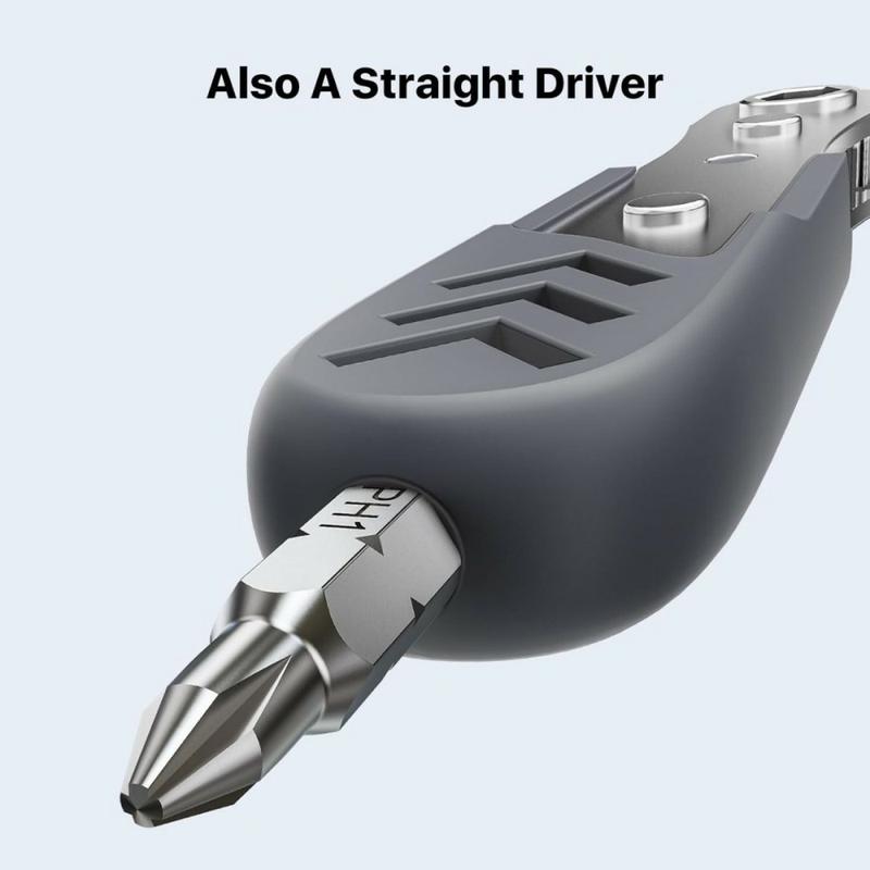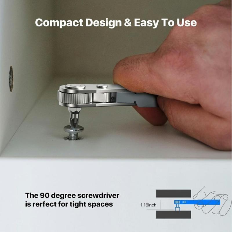Das abgewinkelte Design erleichtert das Arbeiten in engen Räumen, in denen sich ein Standard-Schraubendreher nicht frei bewegen kann. Mit seinem 36-Zahn-Ratschenmechanismus sorgt das Werkzeug für ein sanfteres Drehen bei kleinerem Schwenkwinkel, was die Kontrolle verbessert und die Ermüdung der Hand bei wiederholtem Gebrauch verringert. Es kann auch im geraden Modus verwendet werden, was Ihnen zusätzliche Flexibilität für konventionellere Reparaturaufgaben bietet.