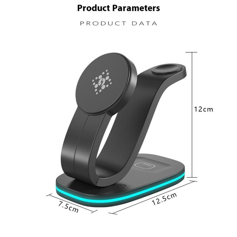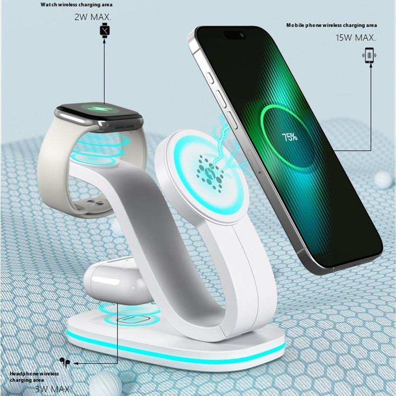 Ein einziger Ständer, der kabelloses Schnellladen mit 15 W ermöglicht, Ihre Smartwatch mit 2 W auflädt, Ihre Ohrhörer mit 3 W versorgt und gleichzeitig als sanftes Nachtlicht dient, sorgt für Ordnung auf dem Schreibtisch.