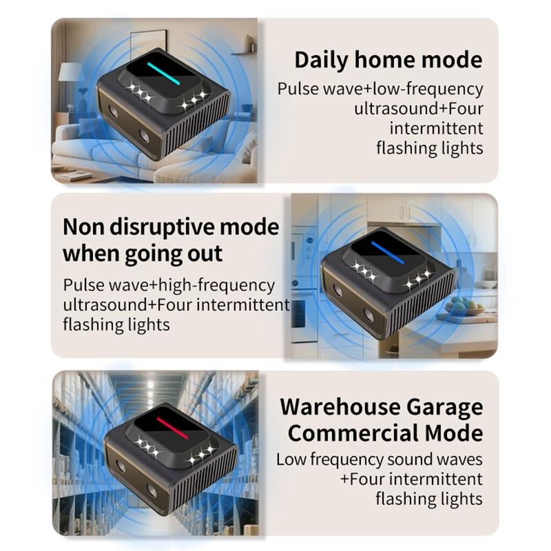 Durch die Kombination von Ultraschallwellen, doppelt gepulsten Druckwellen und einem hochintensiven LED-Blitzlicht schafft das Gerät eine äußerst unangenehme Umgebung für Schädlinge und ist gleichzeitig sicher für Menschen und Haustiere.