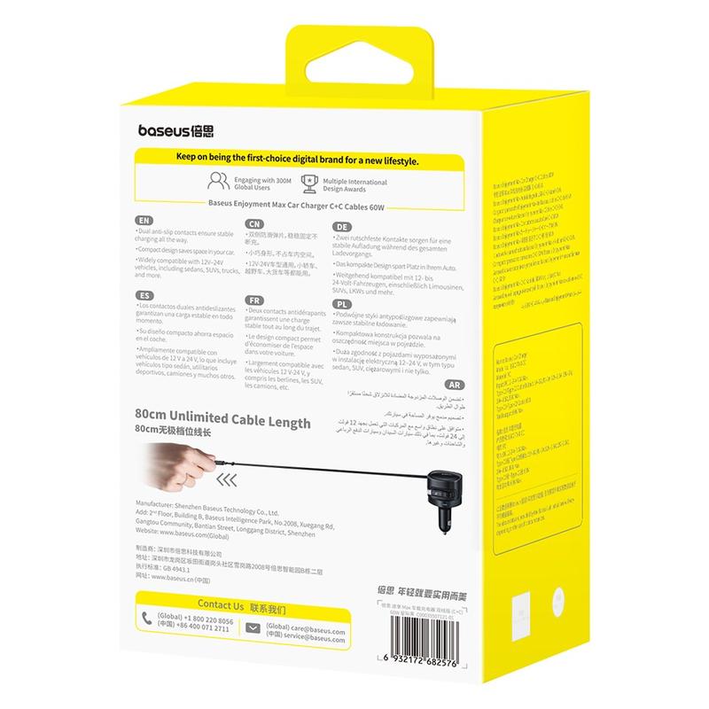 Baseus Enjoyment Max Autoladegerät mit 60W Dual USB-C einziehbaren Kabeln, drehbares Design
