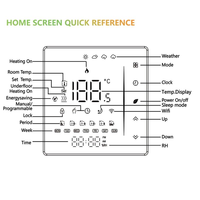Dieser Thermostat verfügt über eine stilvolle, rahmenlose Front mit einem 3,0-Zoll-LCD-Display und einer 2,5D-gebogenen Kante für ein klares, modernes Erscheinungsbild. Verdeckte kapazitive Touch-Tasten bewahren den minimalistischen Look und sorgen gleichzeitig für eine einfache und intuitive Bedienung. Der mehrfarbige LED-Bildschirm ermöglicht es, Einstellungen auf einen Blick zu überprüfen und die Raumbedingungen zu überwachen.