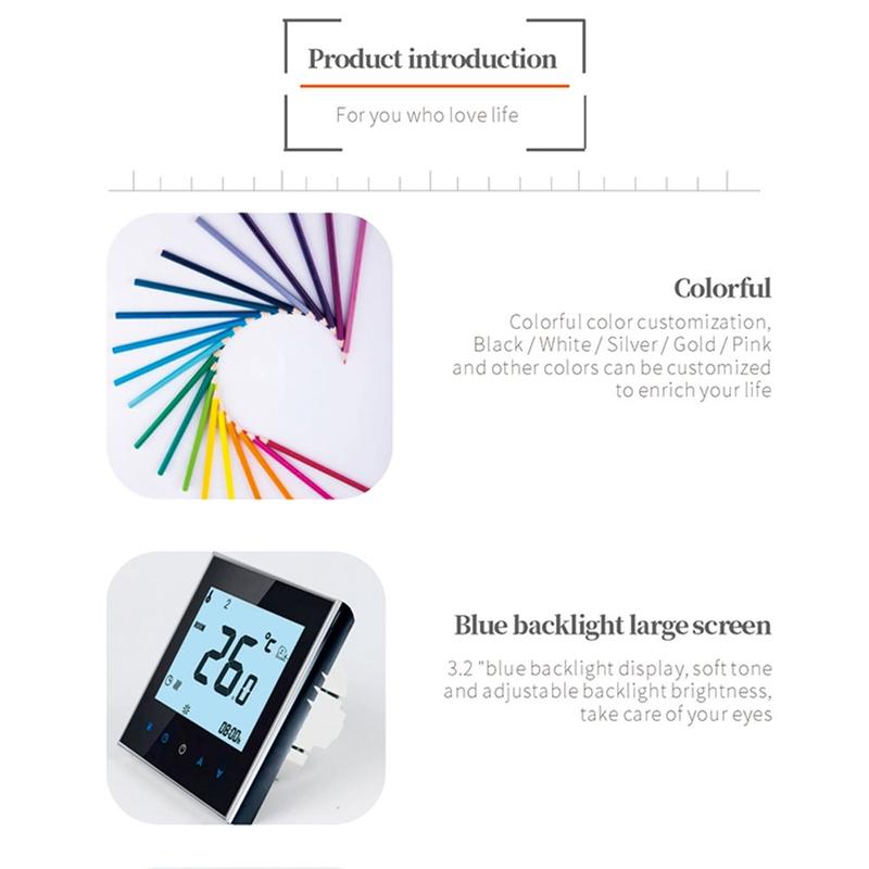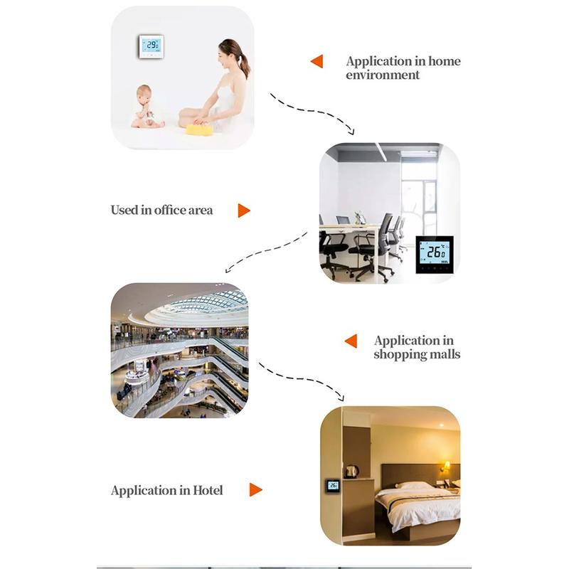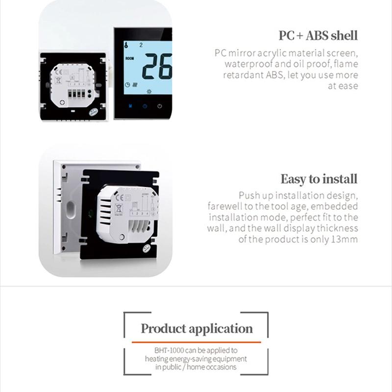 Der intelligente Thermostat BHT-1000GB wurde entwickelt, um eine präzise und stabile Regelung von elektrischen Fußbodenheizungssystemen in Wohnhäusern, Hotels, Wohnungen und anderen Innenräumen zu gewährleisten. Dank seiner genauen Temperaturregelung und einer praktischen Touch-Oberfläche trägt er dazu bei, ein angenehmeres Raumklima zu schaffen und gleichzeitig den täglichen Betrieb einfach zu gestalten. Durch sein modernes Design fügt er sich harmonisch und funktional in eine Vielzahl von Einrichtungsstilen ein.