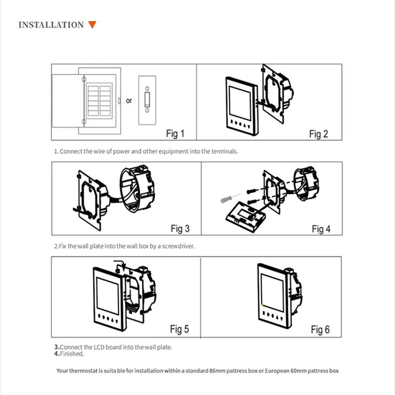 Der BHT-1000GB ist für den Einbau in eine standardmäßige 86 x 86 mm Unterputzdose oder eine herkömmliche europäische Wanddose konzipiert, wodurch er sich leicht in viele bestehende Anlagen integrieren lässt. Seine breite Spannungskompatibilität sorgt zudem für Flexibilität bei der Installation und ermöglicht den Einsatz in einer Vielzahl von Umgebungen, in denen elektrische Fußbodenheizungen verwendet werden.
