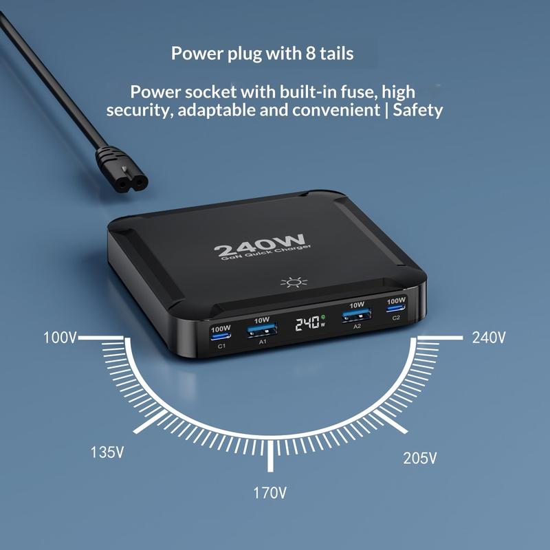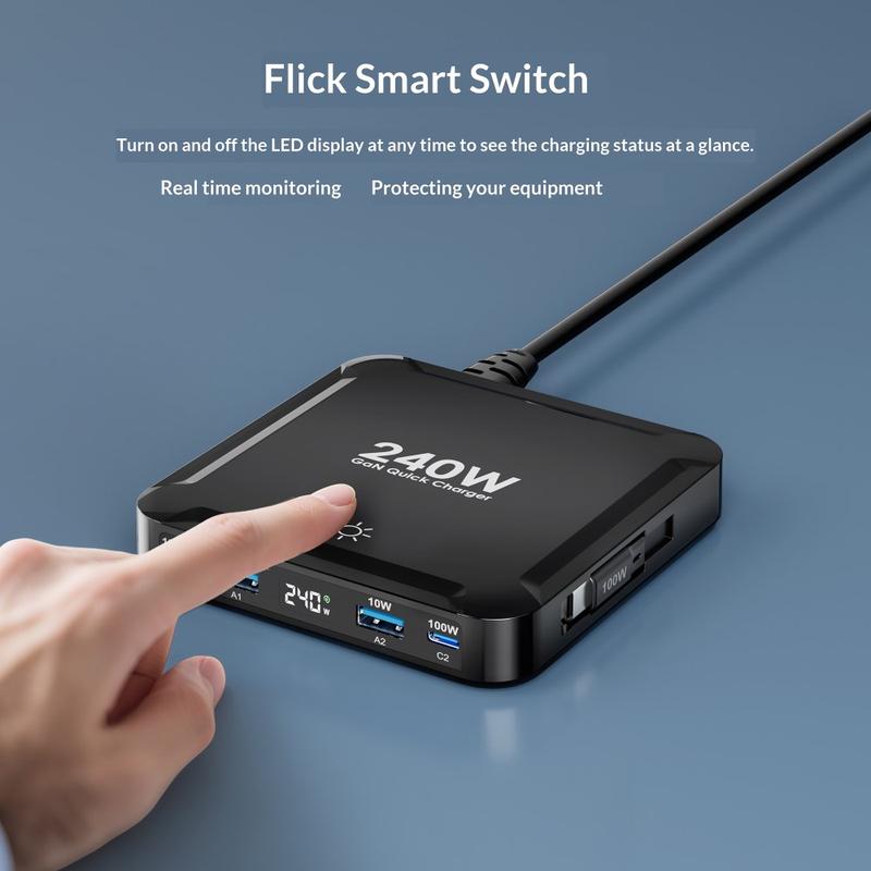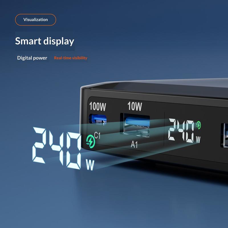 Ein intelligentes digitales LED-Display zeigt Leistungsdaten in Echtzeit an, darunter die Gesamtleistung und die Portaktivität, sodass Sie den Ladezustand übersichtlicher überwachen können. Der berührungsempfindliche Display-Schalter macht es zudem bequemer, den Bildschirm auszuschalten, wenn Sie nachts einen dunkleren Raum wünschen. Der integrierte intelligente Sicherheitsschutz sorgt für sichereres Laden, indem er die Ausgangsleistung automatisch anpasst und vor Überhitzung, Überstrom, Überspannung und Kurzschlüssen schützt.
