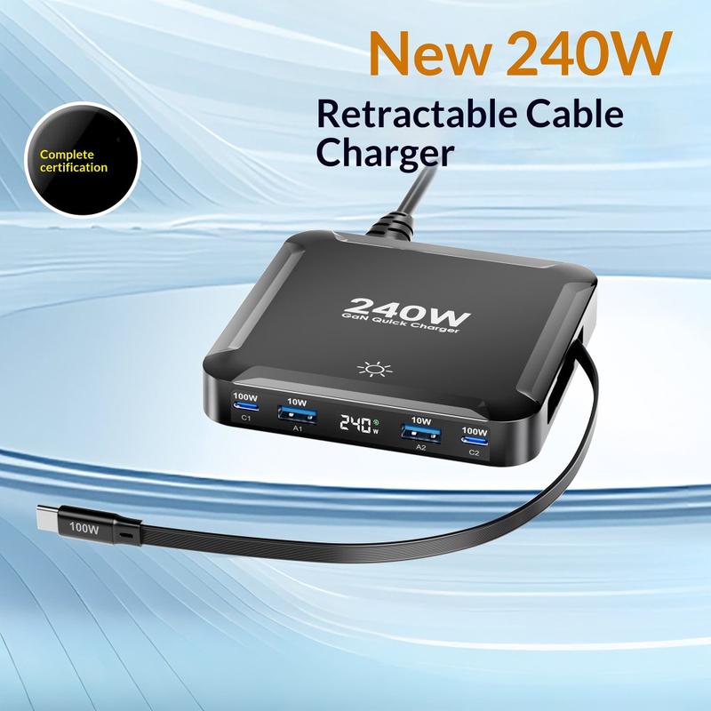 Laden Sie mehrere Geräte effizienter mit der BK-124D-Tischladestation auf, einem praktischen Ladehub mit hoher Leistung, der für moderne Schreibtische, Nachttische und Arbeitsbereiche konzipiert ist. Mit einer Gesamtleistung von bis zu 240W vereint dieses kompakte 5-in-1-Ladegerät 2 USB-C-Anschlüsse, 2 USB-A-Anschlüsse und ein integriertes, einziehbares USB-C-Kabel und ist damit eine hervorragende Lösung, um Smartphones, Tablets, Laptops, Ohrhörer, Powerbanks und andere Alltagsgeräte von einer zentralen Station aus aufzuladen.