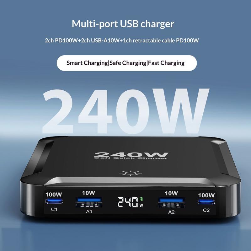BK-124D 240W Tischladestation mit einziehbarem USB-C-Kabel - 2x USB-C, 2x USB-A, Schnellladegerät-Hub mit LED-Anzeige, EU-Stecker