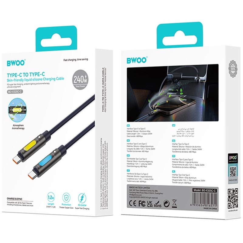 • BWOO USB-C-zu-USB-C-Aromatherapie-Ladekabel 240W, 1.2m - RGB-Beleuchtung, Flüssigsilikon, 480 Mbit/s