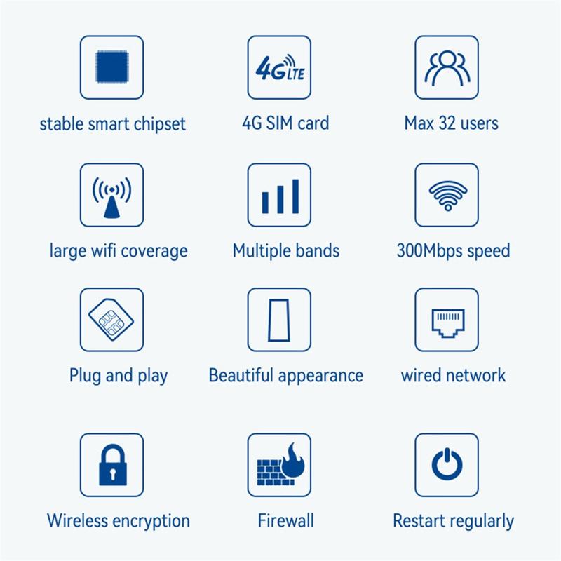 Verwandeln Sie Ihr 4G-Signal in einen Wi-Fi-Hotspot mit einer Reichweite von 20-30 Metern. Der Router unterstützt bis zu 32 Geräte gleichzeitig und ist damit ideal für Haushalte, kleine Büros und Gemeinschaftsräume.