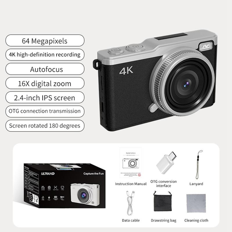 Halten Sie mit der tragbaren Digitalkamera D72 4K jeden unvergesslichen Moment in brillanter Klarheit fest. Diese kompakte und leistungsstarke Kamera wurde für Kreative, Reisende und Fotografiebegeisterte entwickelt. Sie nimmt in Ultra HD 4K-Auflösung auf und bietet einen 16-fachen Digitalzoom für atemberaubende Details aus jeder Entfernung. Mit dem 2,4-Zoll-Display, das sich um 180° drehen lässt, können Sie mühelos perfekte Selfies und kreative Winkel aufnehmen, während das Autofokussystem stets für scharfe, naturgetreue Bilder sorgt. Mit mehreren Aufnahmemodi, darunter Zeitraffer-, Serienbild- und Intervallfotografie, gibt Ihnen die D72 die kreative Freiheit, Ihre Geschichte auf Ihre Weise zu erzählen. Ihr retro-inspiriertes Design kombiniert moderne Leistung mit zeitlosem Stil, und mit der mitgelieferten 32-GB-Speicherkarte können Sie sofort mit den Aufnahmen beginnen.