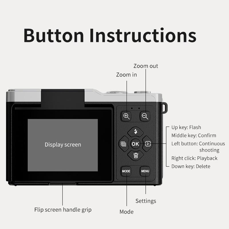 Die D72 Digitalkamera vereint 4K-Auflösung, Mobilität und kreative Aufnahmemodi in einem schlanken Paket. Ganz gleich, ob Sie Reiseabenteuer, Alltagserinnerungen oder Social-Media-Inhalte festhalten, sie liefert Ergebnisse in professioneller Qualität in einem kompakten, benutzerfreundlichen Design.
