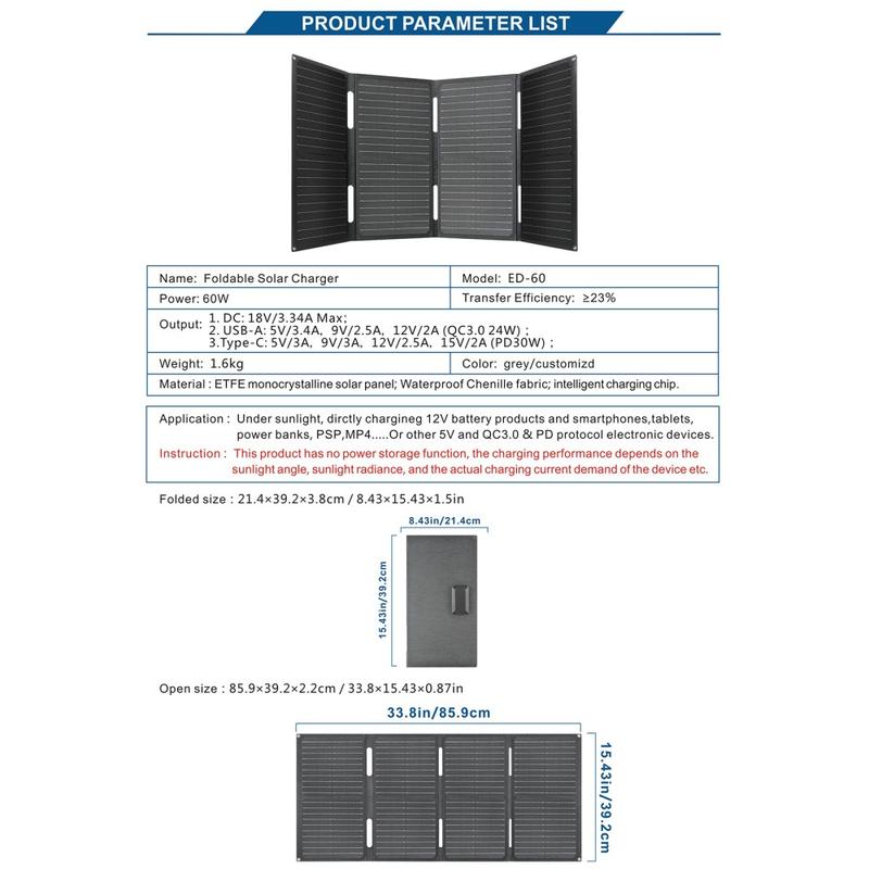 DE-60 60W-Faltbares Solarmodul und Ladegerät - Monokristallines tragbares Solarladegerät mit USB-C-, USB-A- und Gleichstromausgang