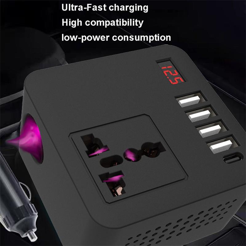 Versorgen Sie Ihre Geräte unterwegs mit Strom - mit dem Digital Display Car Power Inverter, einem kompakten und dennoch leistungsstarken Konverter, der den 12-V- oder 24-V-Gleichstrom Ihres Fahrzeugs in 110-V- oder 220-V-Wechselstrom umwandelt. Er ist mit mehreren Schnellladeanschlüssen, intelligenter Kühlung und vollem Sicherheitsschutz ausgestattet und eignet sich perfekt für Reisen, Camping und den Einsatz in Notfällen.
