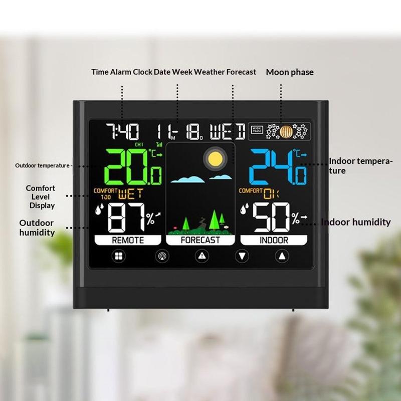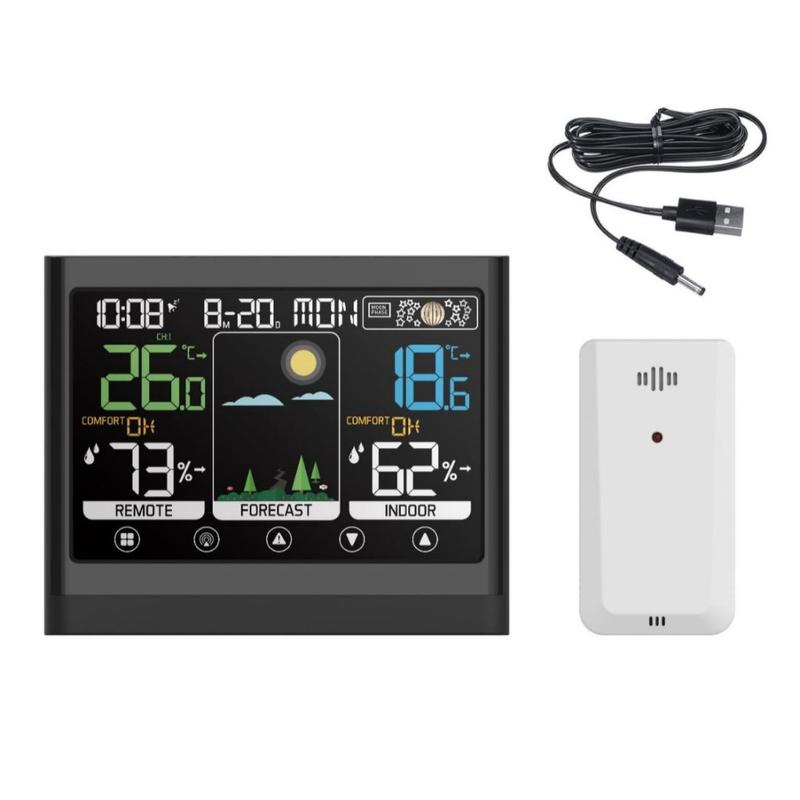 • Drahtlose Wetterstation mit Farb-Touchscreen, Thermometer, Hygrometer und Wecker