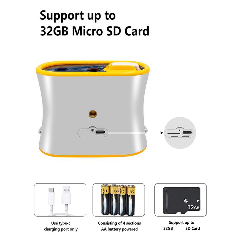 Die DT15 wird mit 4 × AA-Batterien oder Typ-C-Ladung betrieben und eignet sich somit für Reisen und den Einsatz im Freien. Dank seines geringen Gewichts und der mitgelieferten Trageschlaufe können Kinder ihn sicher und bequem tragen. Die Speicherkapazität ist mit einer 32 GB microSD-Karte erweiterbar (nicht im Lieferumfang enthalten).