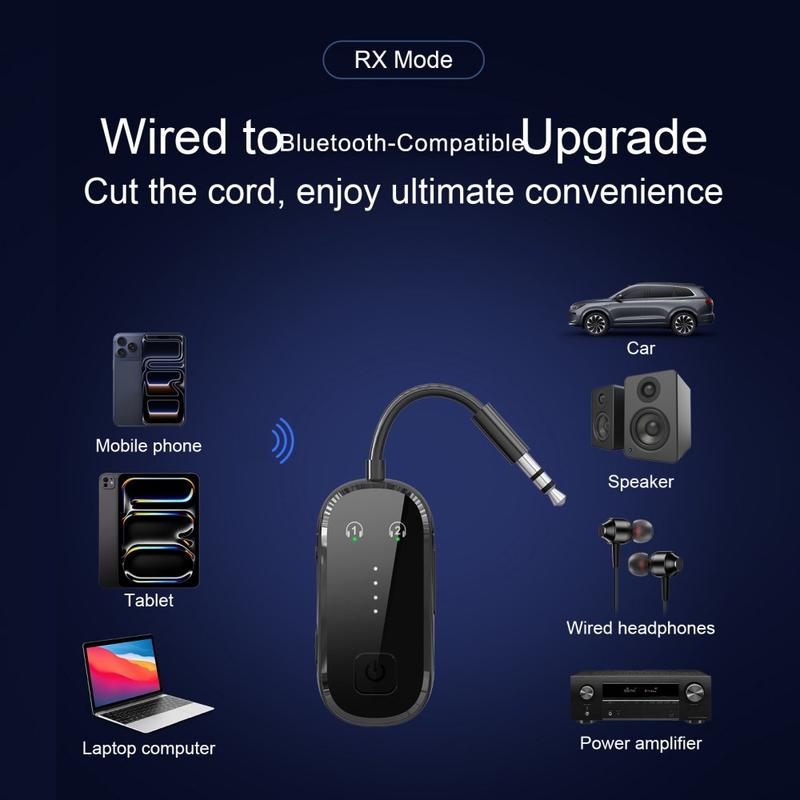 Dank Bluetooth 5.4-Technologie bietet das Gerät eine schnellere Reaktion, stabile Konnektivität und effiziente drahtlose Leistung. Im Sendermodus kann er Audio von kabelgebundenen Quellen an Bluetooth-Kopfhörer oder -Lautsprecher senden. Im Empfängermodus kann er drahtloses Audio von Ihrem Smartphone, Tablet oder einem anderen Bluetooth-kompatiblen Gerät empfangen und über den 3,5-mm-Anschluss an kabelgebundene Audiogeräte ausgeben. Die Dual-Link-Unterstützung sorgt für noch mehr Komfort, da die Verbindung zu zwei Bluetooth-Geräten gleichzeitig möglich ist, was das gemeinsame Hören oder das Umschalten zwischen mehreren Geräten erleichtert.