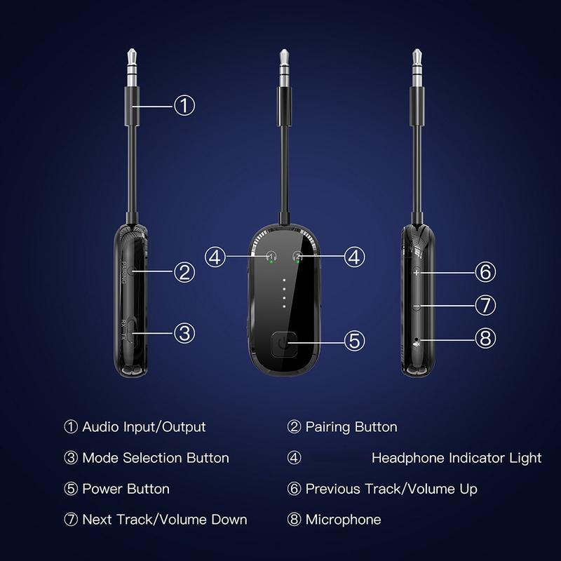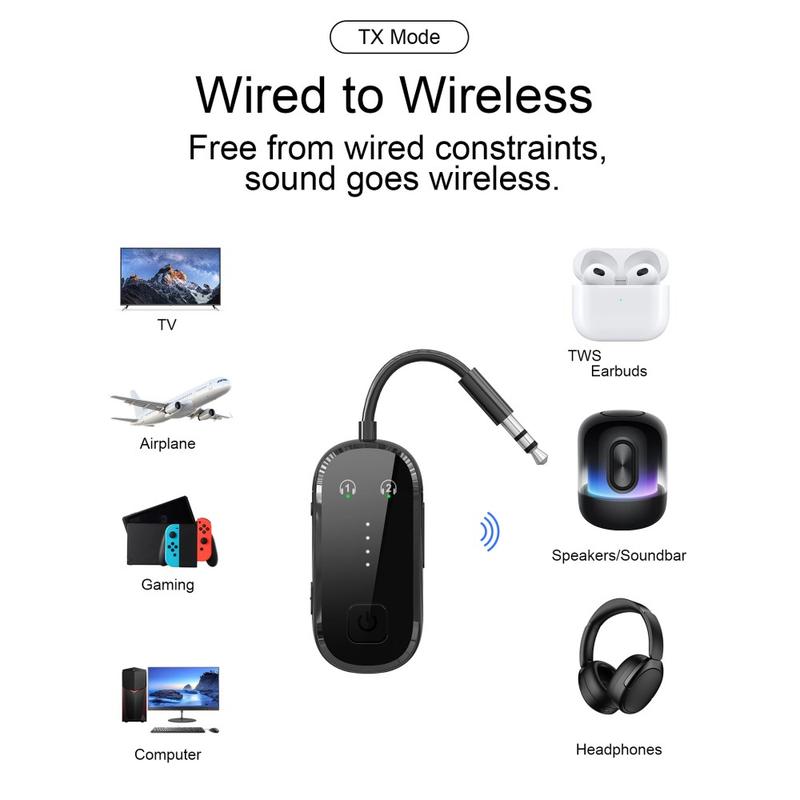 - Verwenden Sie den TX-Modus, um einen Fernseher, PC oder eine andere kabelgebundene Audioquelle mit Bluetooth-Kopfhörern zu verbinden und kabellos Musik zu hören
