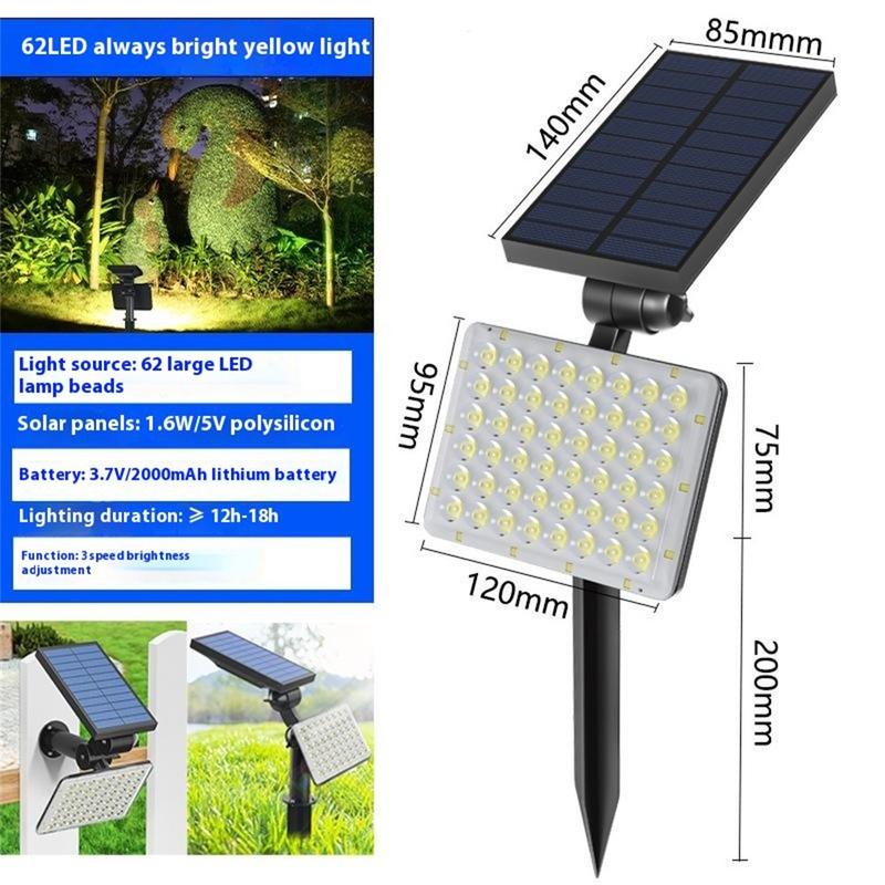 Beleuchten Sie Ihren Außenbereich mit dieser 62-LED-Solar-Erdspießleuchte, die ein rahmenloses Vollschirmdesign und eine leistungsstarke LED-Konfiguration aufweist. Sie eignet sich ideal für Gärten, Gehwege und Landschaftsdekorationen und bietet drei einstellbare Helligkeitsmodi sowie einen langlebigen Solarbetrieb, damit Ihre Nächte hell und einladend bleiben.