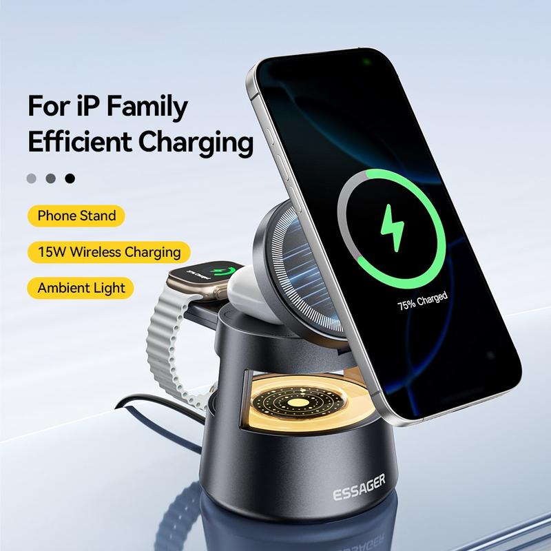 Dieses 4-in-1-Ladegerät von ESSAGER vereint Schnellladung, magnetische Stabilität, sanfte Beleuchtung und Unterstützung für mehrere Geräte in einem einzigen, platzsparenden Design - perfekt für zu Hause, im Büro oder am Bett.