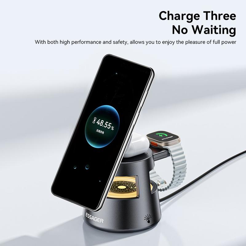 Entrümpeln Sie Ihren Schreibtisch oder Nachttisch mit dem ESSAGER 4-in-1 Magnetic Wireless Charging Stand, mit dem Sie Ihr Smartphone, Ihre Smartwatch, Ihre Ohrhörer und ein weiteres Gerät gleichzeitig aufladen können. Eine kompakte Lösung, die Ihre wichtigsten Geräte mit Strom versorgt und an einem Ort aufbewahrt.