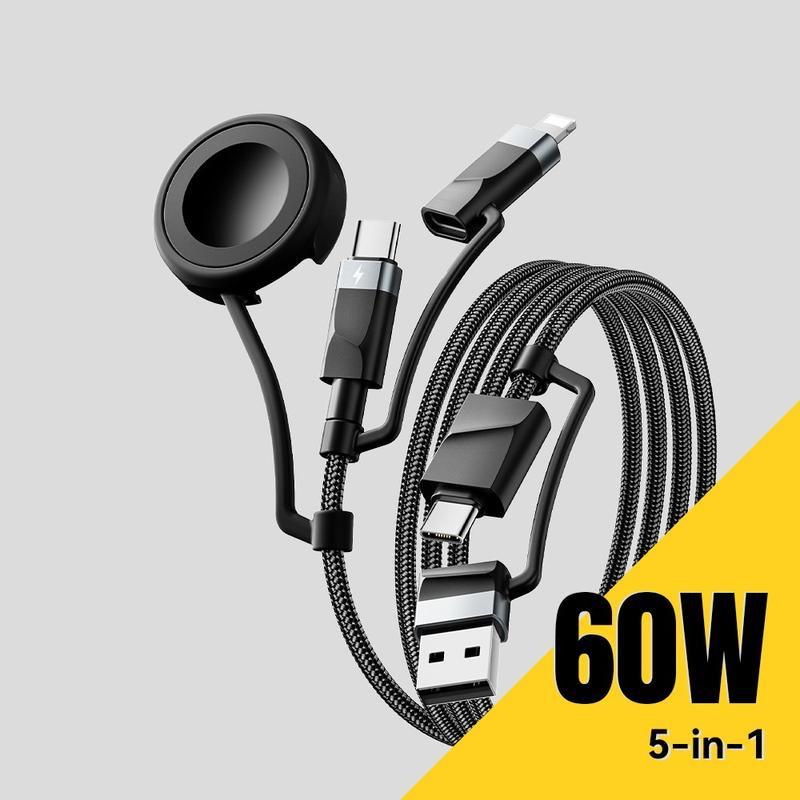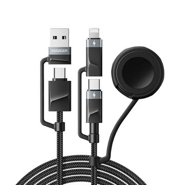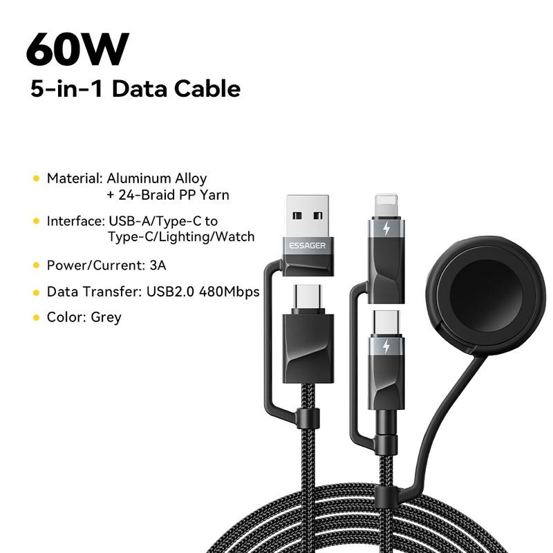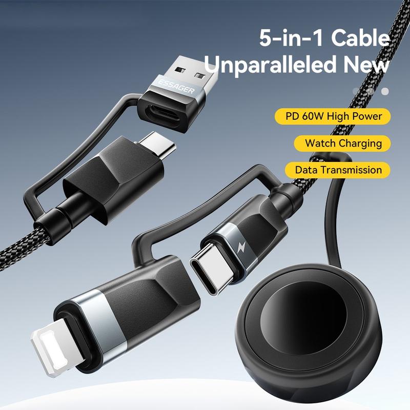 Essager 5-in-1-Schnellladekabel 1m - PD 60 W Multi-Ladekabel mit USB-C-, Lightning-, USB-A- und Apple Watch-Anschluss, 480 Mbit/s Datensynchronisation