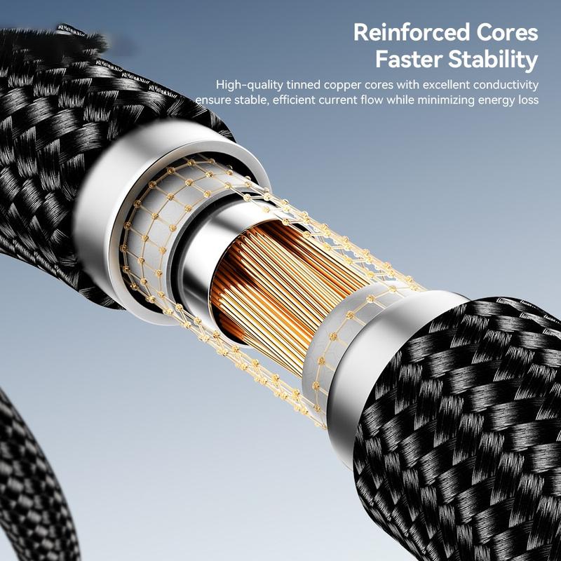 Es unterstützt eine Ladeleistung von bis zu 60 W und kann kompatible USB-C-Geräte schnell mit Strom versorgen, während es gleichzeitig zuverlässiges Laden für andere unterstützte Geräte bietet. Die robusten Anschlüsse aus Aluminiumlegierung und die verstärkte geflochtene Konstruktion des Kabels verbessern die Flexibilität und Widerstandsfähigkeit gegenüber täglicher Abnutzung und machen es ideal für Reisen, das Büro und den täglichen Gebrauch. Ein integriertes Klettband sorgt dafür, dass das Kabel bei Nichtgebrauch ordentlich aufgeräumt bleibt.