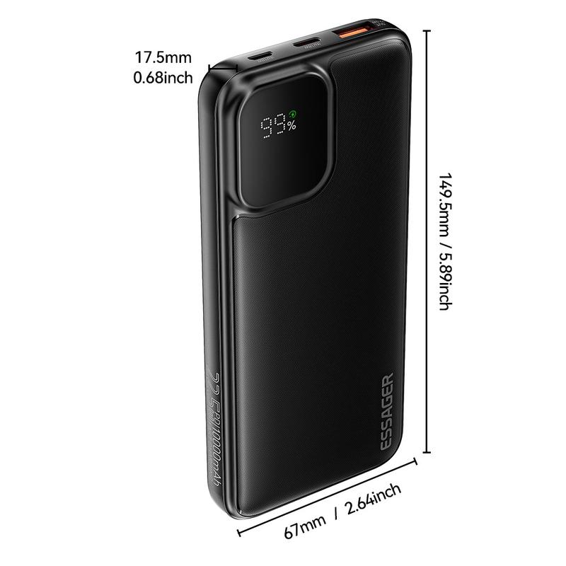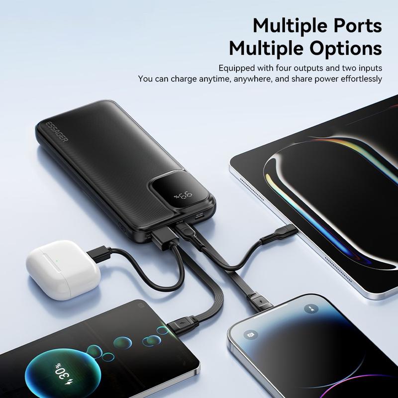Die digitale Powerbank von ESSAGER vereint starke Ladeleistung, zwei eingebaute Kabel und eine klare LED-Prozentanzeige in einem kompakten, zuverlässigen Design - perfekt für Benutzer, die eine All-in-One-Lösung suchen, ohne Extras mit sich führen zu müssen.