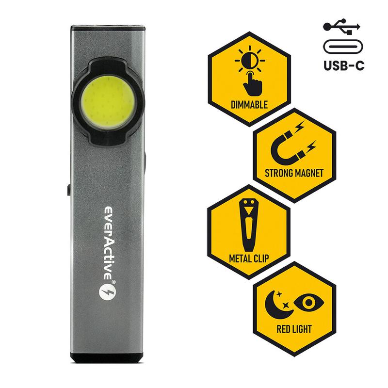 EverActive WL-250R Wiederaufladbare LED-Werkstatt-Taschenlampe - 300 Lumen, 4 Modi, Magnetfuß und Clip
