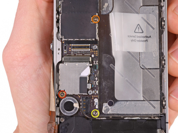 Verstellen Sie das Kabel der Zellenantenne weg von den Metallfingern, die an der Logikplatine befestigt sind.