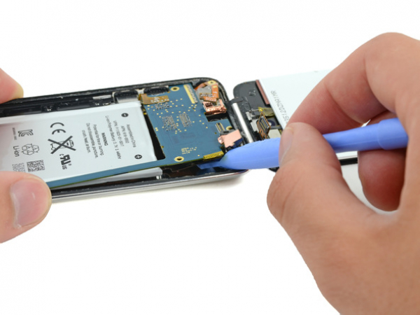 Nachdem sich Sie die Kanten der Batterie gelöst haben, fangen Sie damit an, die Kante der Hauptplatine zu hebeln. Fangen Sie von der Spitze an und setzen Sie fort in Richtung der unteren Seite der Platine.