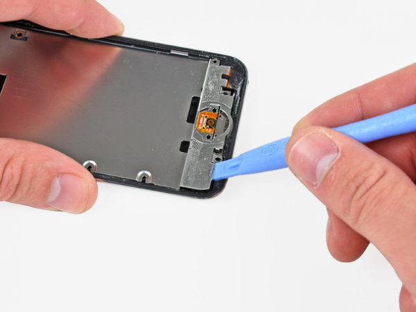 Verwenden Sie den Rand eines iPod-Öffnungswerkzeuges, um die dünne Abdeckung aus Stahl von der Rückseite-Kamera zu hebeln.