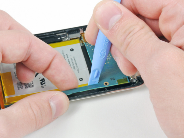 Verwenden Sie ein iPod-Öffnungswerkzeug, um vorsichtig den Rand der Kopfhörerbuchse nahe der Batterie aus ihrer Vertiefung zu hebeln.