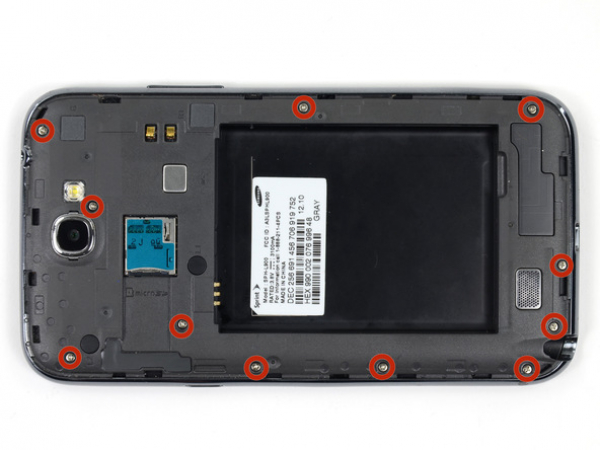 Elf Kreuzschlitzschrauben (4.0 mm) befestigen den Mittelrahmen auf dem Displaysatz. Entfernen Sie sie.