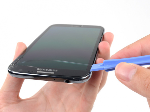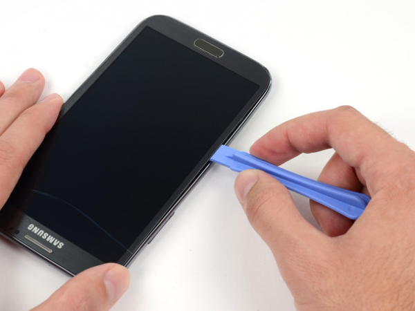 Stecken Sie ein Kunststoff-Öffnungswerkzeug zwischen dem Mittelrahmen und dem Frontplatteset (die Seite des Telefons).