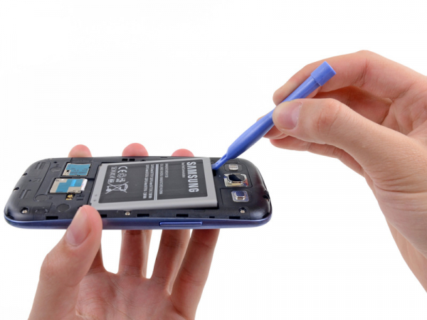 Työnnä muovinen avaustyökalu pieneen loveen akun yläpuolella.