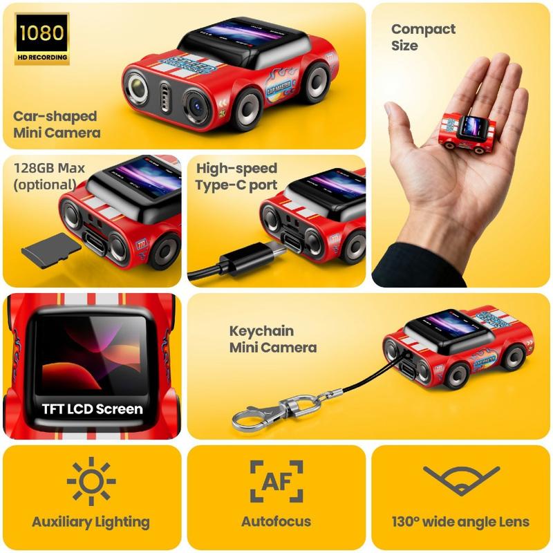 Halten Sie alltägliche Momente fest, ohne eine große Kamera mit sich herumtragen zu müssen. Die G5 AUTO Mini-Daumenkamera kombiniert ein verspieltes Design in Form eines Autos mit echter 1080p-Aufnahme und ist damit ein unterhaltsames und praktisches Accessoire für Studenten, Pendler und alle, die schnell Aufnahmen machen möchten. Befestigen Sie sie mit der mitgelieferten kurzen Kette an Ihren Schlüsseln, Ihrem Rucksack oder Ihrem Schlüsselband - mit nur 0,026 kg ist sie leicht und lässt sich überallhin mitnehmen.