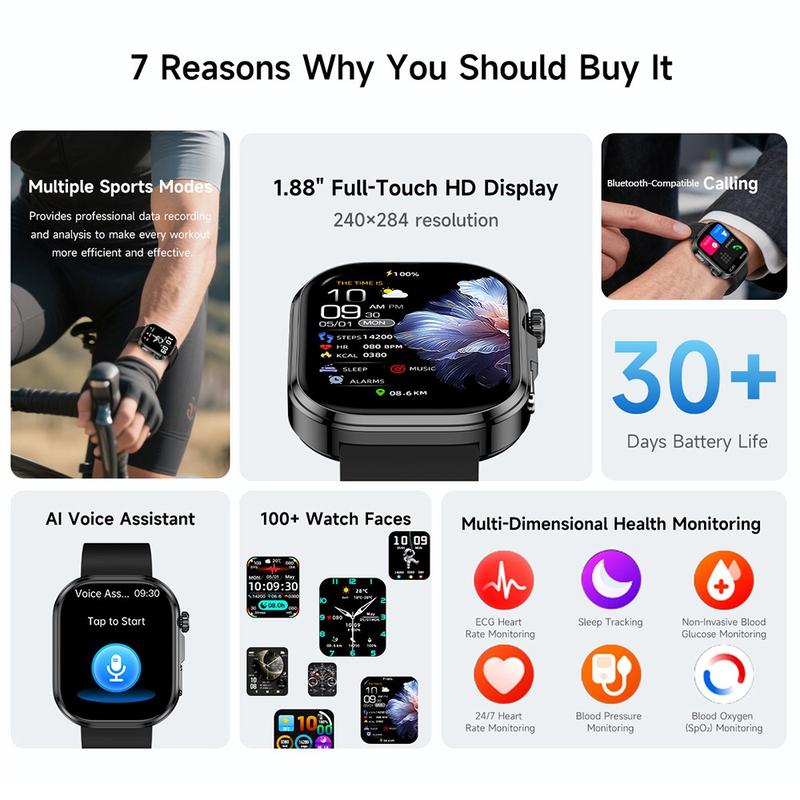 GE52 Smart Watch mit 1,88" HD-Bildschirm - EKG-Herzgesundheitsmonitor, Bluetooth-Anrufe & Fitness-Tracker